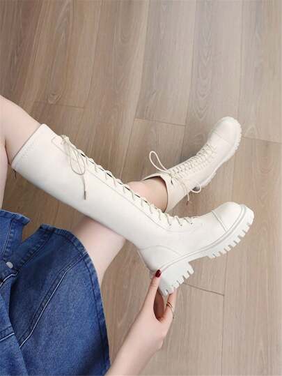 2025 Autumn New Brown Knee-High Boots For Women, Flat, Over-The-Knee, Lace-Up, Slimming, Plus Size 43, High Shaft Boots - White - View 6