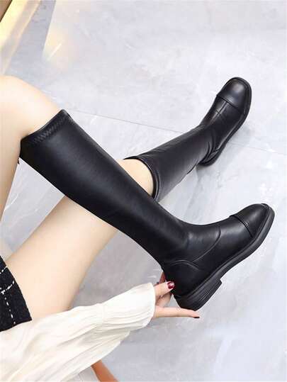 2025 Autumn/Winter New Black Flat Elastic Knee-High Boots, Slim Fit Plus Size Soft Bottom Riding Boots, Tall Shaft Boots - Black - View 1