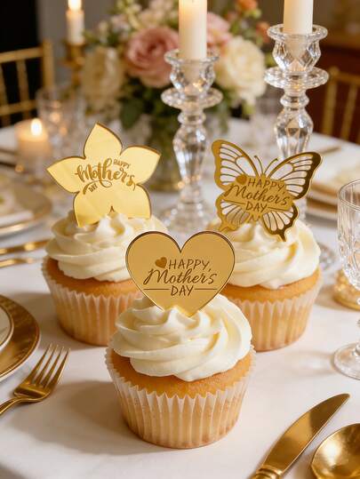 24/12/3pcs Gold Mirror Acrylic Cup Decor - Butterfly, Star And Heart Combination, Mother's Day Gift