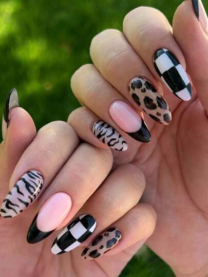 24pcs Long Almonds French Tip Press On Nails Leopard Checkerboard Design Fit Perfectly Design Acrylic False Nail, Contain 1pc Jelly Glue And 1pc Nail File French Tip Nails For Women And Girls Daily Life And Party Use