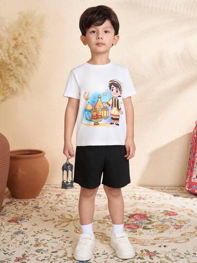 2pcs Boys' Summer Casual T-Shirt & Shorts Set, Soft Fabric, Minimalist Fashion - Black and White - View 1