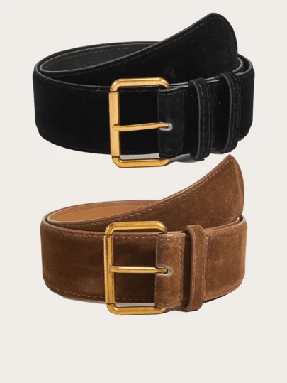 2pcs Brown & Black Fuzzy Retro Casual PU Leather Belt, Suitable For Autumn/Winter Outfits
