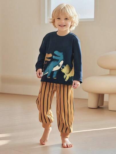 2pcs Knitted Fabric Boy Set, With Dinosaur Print Design Sweatshirt And Striped Sweatpants, Pullover And Regular Fit Cargo Pocket Sweatpants, Autumn And Winter Series, Suitable For Daily Life And Outdoor - Navy Blue - View 1