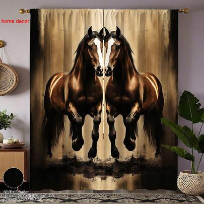 2pcs Set Vintage Brown & Black Horse Print Curtains - Rod Pocket Design, Polyester, Perfect For Living Room, Kitchen, Bedroom, Study, Dining Area - Home Decor (Rod Not Included) - Multicolor - View 1
