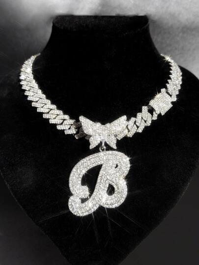 2pcs Sparkling Butterfly Letter Pendant Silver Women Necklaces, Glittering AAA Rhinestone Paved Cuban Chain, Zinc Alloy Initial Jewelry For Women, Perfect For Parties, Birthdays, Christmas, Anniversary, Valentine's Day, And Everyday Wear - Stylish Gift Idea,Mom,Mother,Mother's Day,Gift - Butterfly - View 1
