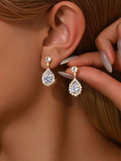 2pcs Sparkling Cubic Zirconia Crystal Dangle Earrings, Bridal Wedding Dress Accessories, Party & Formal Event Earrings - Gold - View 1