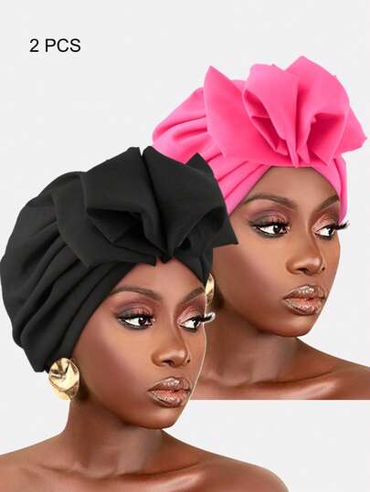 2pcs Women's Bow Knot Elastic Pleated Solid Color Turban Hats, Suitable For Daily Use,Summer,Beach