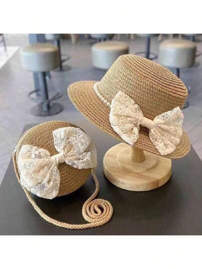 2st/set Girls Princess stråhatt & väska, söt blom- och rosettdesign, sommar strandhatt & väska set, mångsidig för dagligt bruk - Kaki - Visa 1