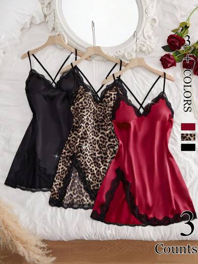 3 Pcs Valentine's Day Surprise Gift Lace Trimmed Satin Split Sexy Lingerie Set, V-Neck Cross-Tie Backless Slim Fit Dress, Women's Comfortable & Erotic Nightdress & Nightgown - Mixed Colors - View 1