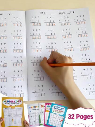 32-sidig grundläggande matematikarbetsbok för barn, inkluderar addition och subtraktion med tallinjer, addition och subtraktion under 1000, blandade operationer, multiplikations- och divisionsövningar, lämplig för förskoleundervisning och dagis, odlar barns intresse för att lära sig matematik, förbättrar inlärningsförmågan, stimulerar logiskt tänkande, en idealisk present för barn och skolstartssäsongen. - Multifärgad - Visa 10