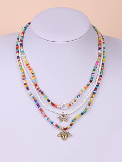 3pcs Butterfly Charm Beaded Necklace - Multicolor - View 1