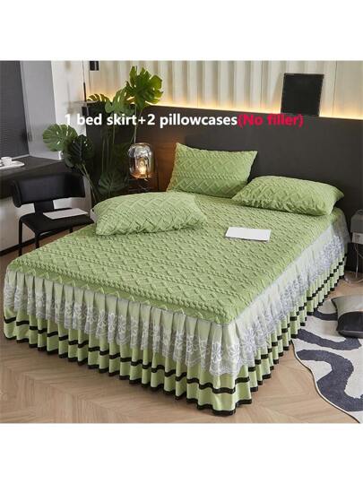 3pcs Microfiber Lace Bedding Set (1pc Bed Skirt + 2pcs Pillow Shams), Elegant Lace Trim Design, Moisture-Wicking, Breathable, Wrinkle-Resistant, Quiet, With Removable Mattress Protector - vanilla green - View 1