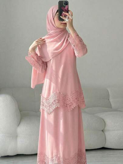 3st/set Tween Girls långärmad topp med broderade blommor spets, byxor och huvudduk, lämplig för utflykt, skola, hem och Ramadan Abaya-ceremonin - Babyrosa - Visa 2
