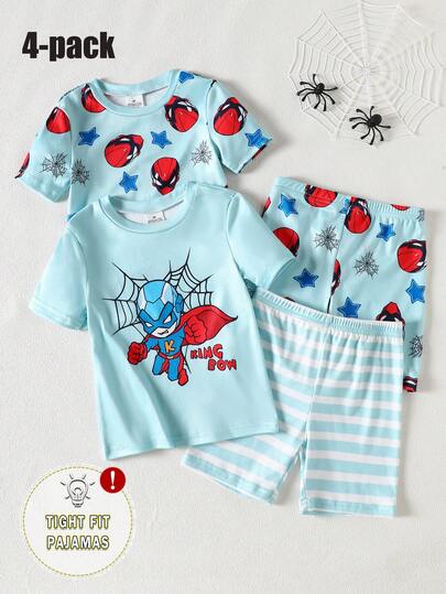 SHEIN GraphicGems 4pcs/Set Toddler Boys' Cartoon Star, Robot, Striped Print Short Sleeve Tee And Shorts Pajama Set, Comfortable, Stretchy, Casual Summer Loungewear
