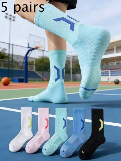 5 Pairs Men's Crew Socks, Spring/Summer Professional Grade High Elasticity Shock-Absorbing Basketball Crew Socks, Designed For Different Foot Strength Distribution, Breathability And Protection Needs. Featuring Differentiated Knitting Structure, Mesh Design On Forefoot Area For Enhanced Breathability.