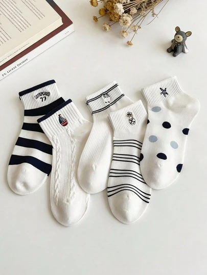 5 Pairs Women's Cute Sweet Bear, Navy Stripe, Polka Dot, Embroidery Design Breathable Short Invisible Socks With Ruffle Hem, Ankle Socks And Short Tube Socks, Fashionable Socks In Ins Style, White Socks, Pink Socks, Suitable For Daily Casual Wear In Spring, Summer, Autumn And Winter, All-Season Applicable