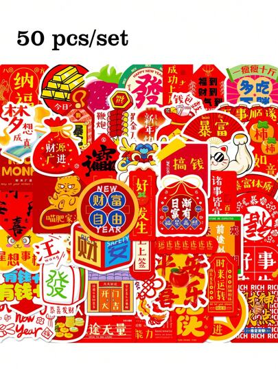 50pcs/Set New Year Prosperity Blessing Stickers, 2026 New Year Party Decor Stickers For Office Supplies, Computers, DIY Decoration, PVC Waterproof Stickers - Multicolor - View 1