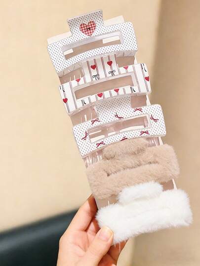 5pcs/Set Cute High-End Versatile Large Pink Sweet Heart & Square Fuzzy Hair Clips, Strong Grip, Minimalist Daily Women Hair Accessories, Suitable For Thick/Thin Hair, Elegant Cute Casual Street Style, Suitable For Spring, Summer, Autumn, Winter, Valentine's Day Women Hair Claws Elegant Claw Clip - Multicolor - View 1