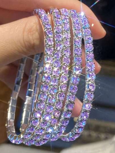 5pcs Sparkly Crystal Elastic Bangle Bracelets, Adjustable Party Style Bling Bling Wristwear, Elegant Gifts For Women - Purple - View 1