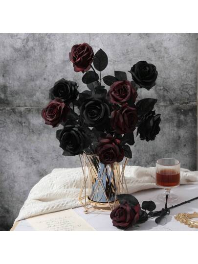 6/10 st svarta konstgjorda sidenrosor, falsk blombukett för halloweenfest och mörk inredning, alla hjärtans dag, present - Svart - Visa 10