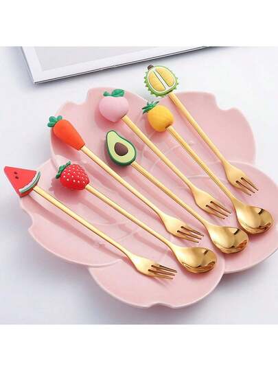 6/5/4/3/2/1 Pc Set Cute Cartoon Fruit Forks & Spoons, Fruit Pattern, Pudding, Ice Cream, Dessert, Noodle, Salad, Golden Stainless Steel Forks & Spoons, Multi-Color, Ideal For Desserts, Cakes, Kitchen, Dining, Back To School, Cafeteria, Fruit, Party, Picnic, Hygienic & Elegant - Gold - View 1