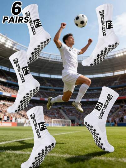 6pairs Men's Thick Cushioned Football/Soccer Socks, Ankle/Crew Length, Anti-Slip, Sports Socks, For Gym, Fall - White - View 1