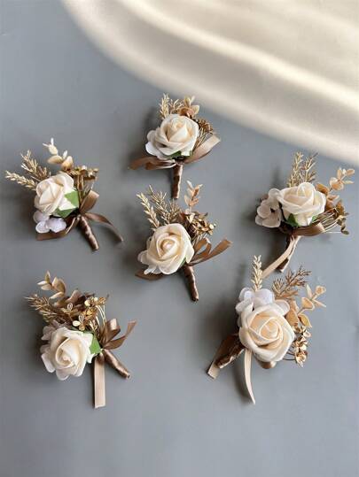 6pcs Artificial Champagne Rose Flowers Groom Boutonniere Man Corsage Graduate Pin Suit Wedding Flowers Party Decoration Valentine's Day - Corsage - View 1