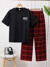 Teenage Boys' Plaid Pants And Printed Short Sleeve T-Shirt Set, Fashionable Homewear