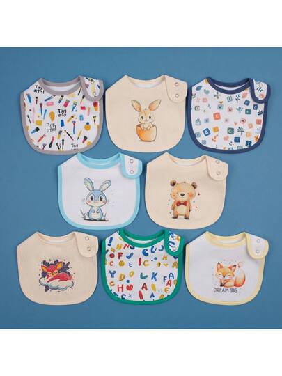 8pcs/Set Cute Cartoon Animal Print Waterproof Adjustable Snap Bibs For Baby Boys And Girls, Suitable For Spring, Summer, Autumn And Winter - Khaki - View 1