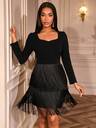 AOMEI Damklänning med hjärtformad halsringning, fransar och skiktad bodycon-klänning, långärmad, festklänning med tofsar och fransar, svart