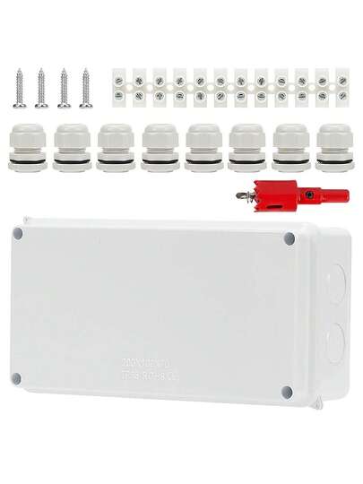 Product Specifications: Size: 20 x 10 x 7 cm (Reference image for detailed size) Material: ABS Color: White Package Includes: 1 x Junction Box, 8 x Waterproof M24 Cable Thread, 1 x 12 Striplen Terminal Blocks, 4 x Stainless Steel Screws Product Introduction: ✅[IP65 Waterproof] It is specially designed for indoor and outdoor use. Benefiting from heavy-duty sealing rubber, the IP65 junction box and cable glands offer good protection against water, dust, corrosion, rats, and pets, and will last for years. ✅[Durable Professional Material] The junction box, terminal blocks, and cable glands are all made of new material and last longer than other materials. The terminal blocks and cable glands are made of professional nylon, and the clamps are made of zinc alloy. ✅[Easy to install] All accessories are included. Simply drill holes, install the cable in the junction box, secure it, and tighten the screws. You're done. ✅[Wide applications] Suitable for electrical installations, outdoor wiring, and cable repairs or extensions. This waterproof junction box is ideal for harsh industrial or outdoor environments. ✅[Package list] 1 x IP65 junction box, 1 x 12-way terminal block, 10 x M20 waterproof cable duct brackets, 1 x 20mm Forstner bit, and 4 x stainless steel screws.