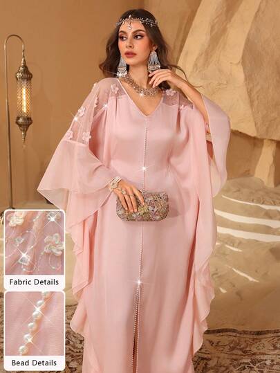 Al Najma Embroidered Patchwork Ruffle Cuff Fashionable Turkish & Arabic Traditional Long Tunic For Women Kaftan Jalabiya Dress - Pink - View 1