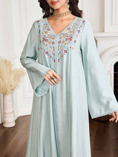 Al Najma Elegant broderad långärmad klänning i arabisk stil för kvinnor - Multifärgad - Visa 1