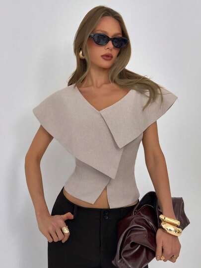 Aloruh Women's Elegant Artistic Stylish Romantic Date & Commute Asymmetrical Lapel Blazer Jacket, Spring/Summer - Khaki - View 1