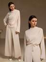 Vår- och sommarkläder för kvinnor med enkla knappar och en avslappnad långskjorta i kombination med vida byxor. En elegant vinteroutfit för kvinnor, lämplig för semestrar och dejter.