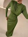 Olivgrön långärmad klänning med veckad midja och glansig A-linjeform för kvinnor, elegant och mångsidig