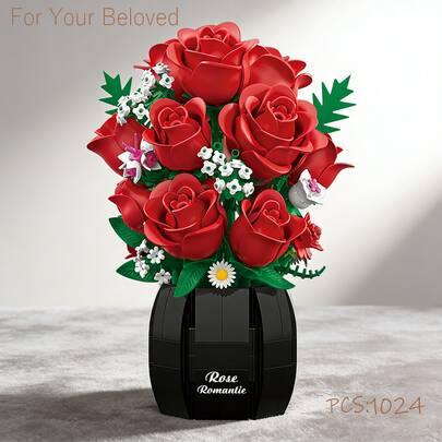 Monterade rosbukettbyggklossar, snygg gör-det-själv-leksak, perfekt present till flickvän/älskare/familj, idealisk hemdekoration för nyår och alla hjärtans dag - Röd - Visa 6