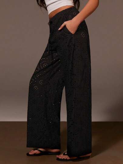 Athîral Svarta, broderade, vävda, raka byxor för dam, casual semesterbyxor - Svart - Visa 1