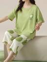 AICJ 2st/set Kvinnor Söt Björn & färgblocktryck nattkläder Set, Casual kortärmad rundhalsad T-shirt och fickshorts, hempyjamas kostym, två delar set