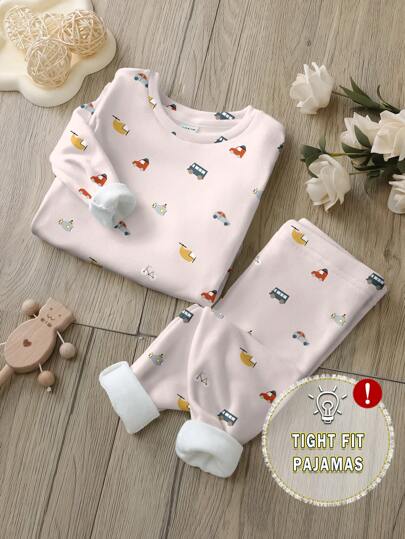 SHEIN Leap Crew Babypojke Casual Tecknade Bilmönster Tätt Passform Långärmade Rund Halsbyxor Termofodrade Varma Loungekläder, Lämpliga För Höst/Vinter - Multifärgad - Visa 2