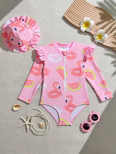 Baby Girl Cute Flamingo Print Long Sleeve One-Piece Swimsuit – Tropical Toddler Bathing Suit With Sun Protection, Pink Flamingo Outfit For Beach, Pool & Summer Photos Tropical Toddler Babygirl Bathing Suit Baby Girl One Piece Swimsuit Baby Girl Flamingo Outfit Baby Girl Swimsuit Long Sleeve - Multicolor - View 1