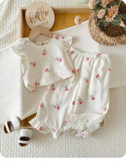 Babygirl Cute Casual Summer Apricot Floral Print Flutter Sleeve Top And Pants Set - Apricot - View 1
