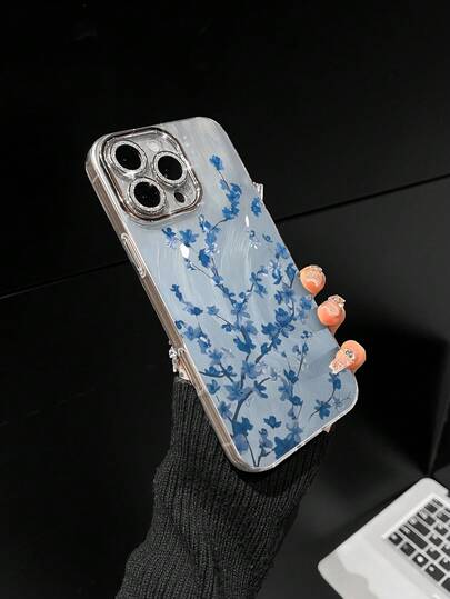 Blue Branch Flower Pattern Phone Case, Personalized Compatible With Iphone 16 Pro Max, 15, 14 Plus, 13, 12, 11 Protective Cover - Fine Hole Feather Yarn - View 1