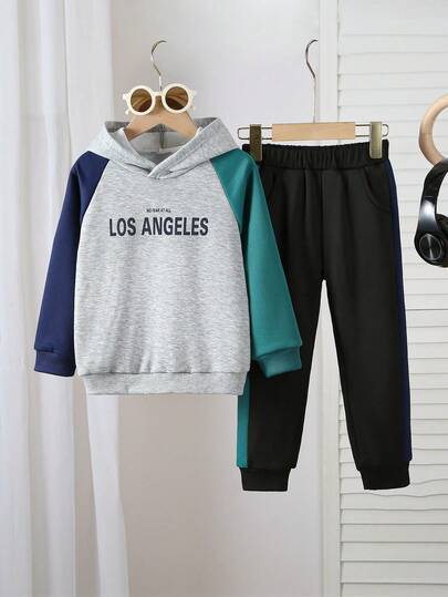 Boys Gray Hooded Sweatshirt With Color Block Harem Pants, Korean Style, 2pcs Set, Loose Fit, Fashionable, Spring/Autumn - Grey - View 1