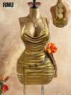 RNU Plus Size Women's Elegant Shiny Metallic Knit High Elasticity Draped Neck Backless Waist Ruched Dress With Gold Sequin Decor, Versatile Design For Party, Gathering, Night Date