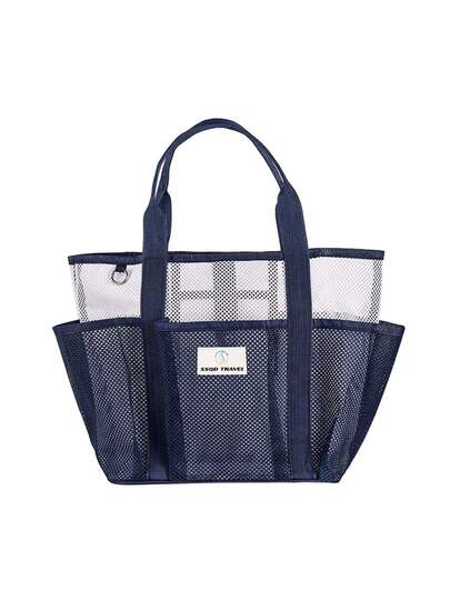 Breathable Mesh Beach Toiletry Bag With Zipper And Side Pockets, Large Capacity Multi-Pocket Organizer Pouch, Foldable Mesh Beach Tote Bag, Essential For Beach And Vacation Travel - Navy Blue - View 1