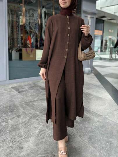 Casual Closed Lantern Long Sleeve, Breasted, Hem Side Slit Ladies Arabian Dress Suit,Modest - Coffee Brown - View 1