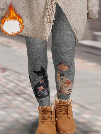 EMERY ROSE Casual Minimalist Cat Print Plus Size Women Long Thick Thermal Lined Leggings
