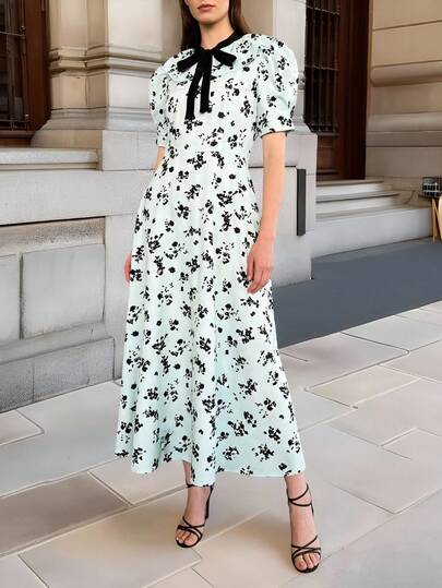 Casual Women's A-Line Long Dress, Contrast Color Collar, Short Puff Sleeves, Ruffle Hem, Printed Mid-Length Dress, Woven Fabric - Mint Green - View 1