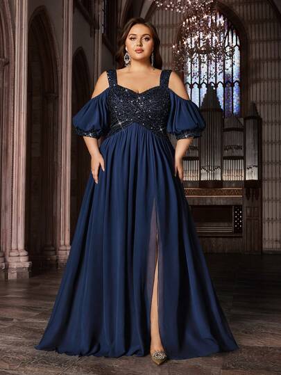 Chic Appeal Plus Size Women Chiffon Curve Maxi Formal Dress Sequins Straps Evening Gown Solid Color Cold Shoulder Short Sleeves Slit Long Dresses - Navy Blue - View 1